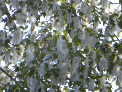 I’m sorry this picture is so fuzzy but in a way it rather fits. This is high up in one of our many many cottonwood trees on the Farm (high up and a small little camera is why it is fuzzy). The “cotton” hangs in great clumps awaiting a breeze to launch itself to swirl and swirl, up and down and up again and in and out and out and in our eyes and mouth and up our noses.